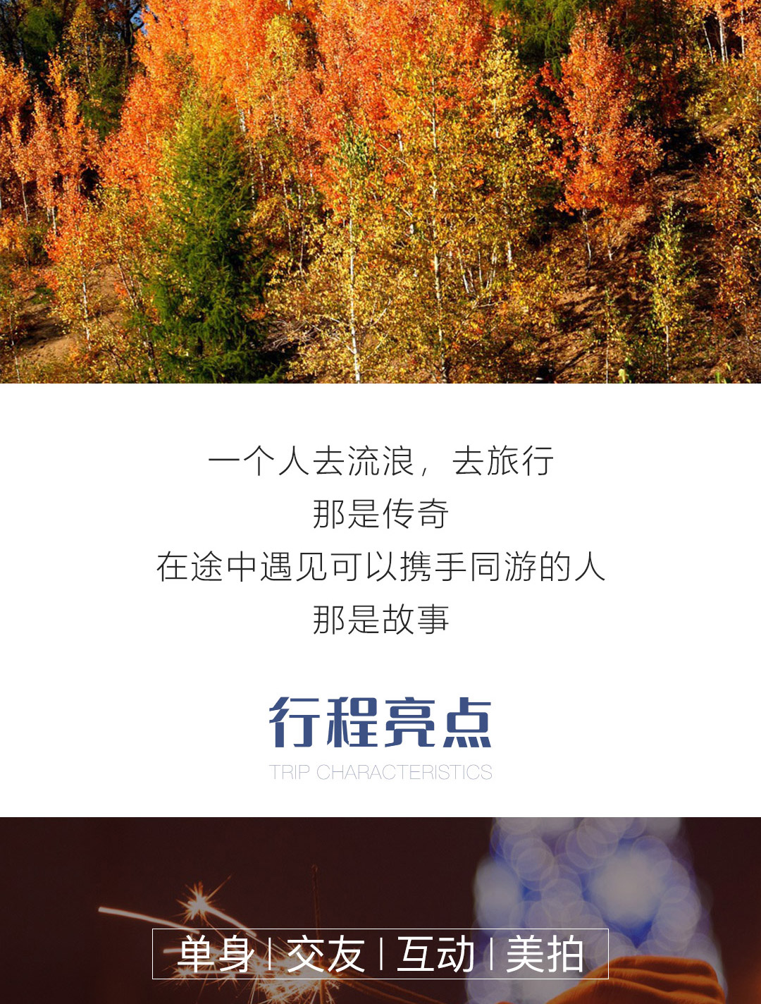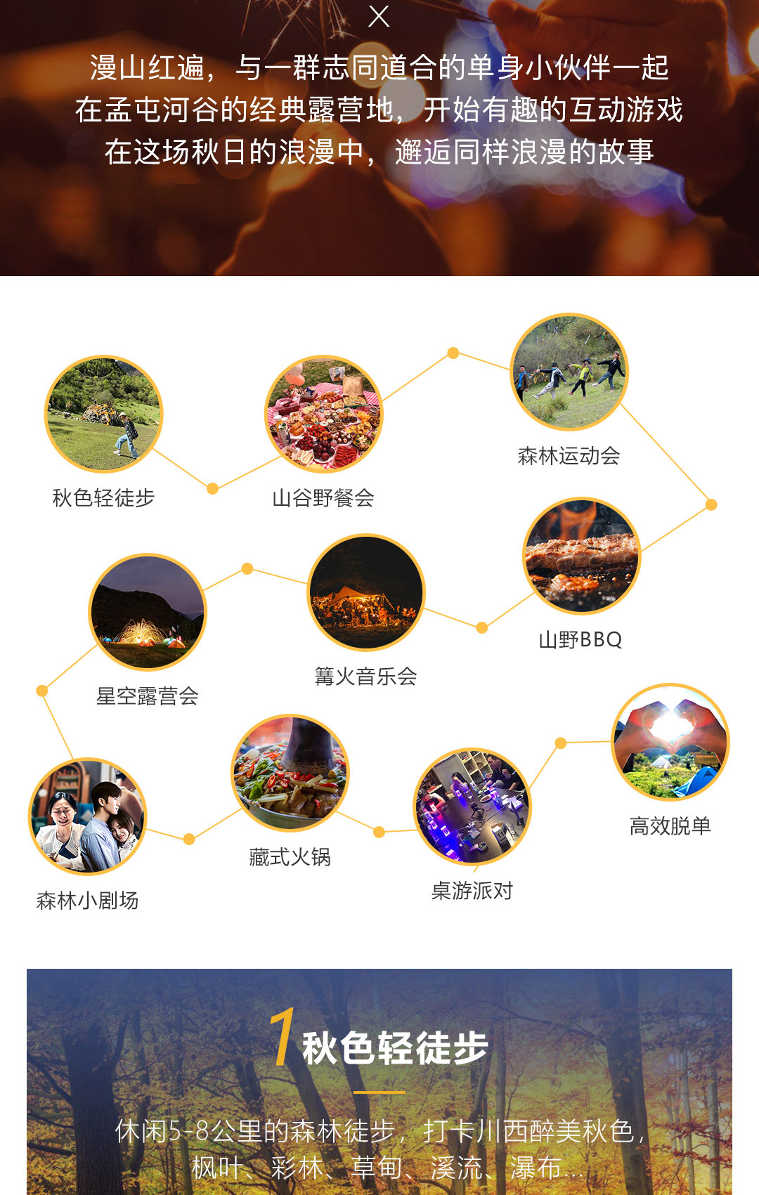 走过山头,坐在夕阳勾勒的黄昏里,像风走了八百里不问归期,在山野之间,与有趣的灵魂共鸣,邂逅一场独一无二的单身之旅。 旅行主题:单身旅行主题; 景观亮点:红林彩叶,星空露营; 参团客群:24-36岁渴望爱情的单身男女; 团队人数:18人起成团,低于18人此团自动解散,所支付费用自动返回原账户; 集合解散:成都出发,成都散团; 特别告知:本产品全程纯玩无购物; 支付方式:在线支付+团上现付,详情请查看“费用包含”栏。