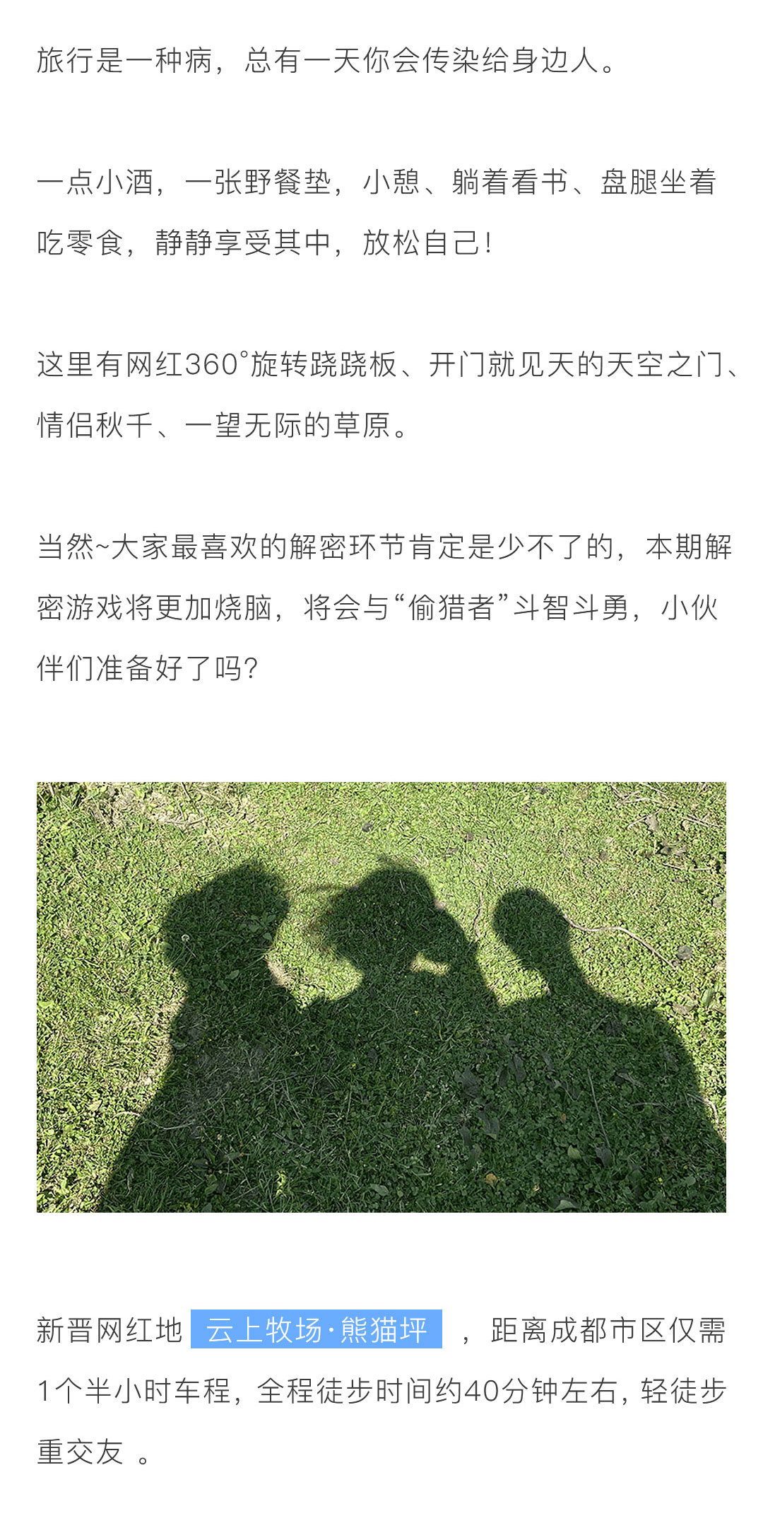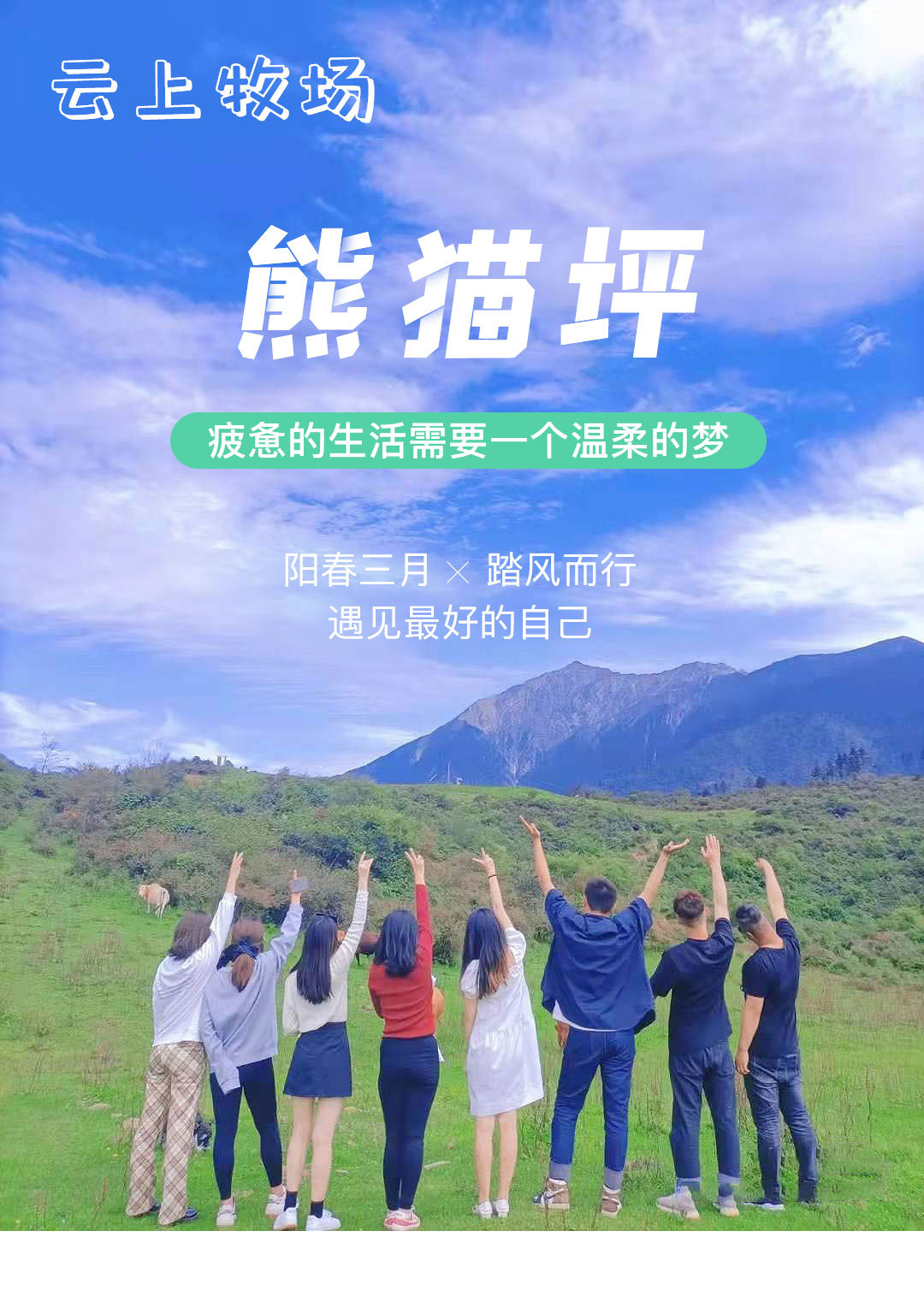 熊猫坪户外徒步交友1日游——疲惫的生活需要一个温柔的梦。工作结束了就是要去爬山,去冲浪,去告白,去探险,去海边看落日,去草原呐喊,去嗨个一整天,不去想人生的烦恼和生活中的不快,来熊猫坪吧,抓住这个最好年纪,别错过最好的自己...景观亮点:蓝天白云,瑞士风情牧场; 参团客群:中青年旅游爱好者; 团队人数:12人起成团,低于12人此团自动解散,所支付费用自动返回原账户; 集合解散:成都出发,成都散团; 特别告知:本产品全程纯玩无购物; 支付方式:在线支付+团上现付,详情请查看“费用包含”栏。