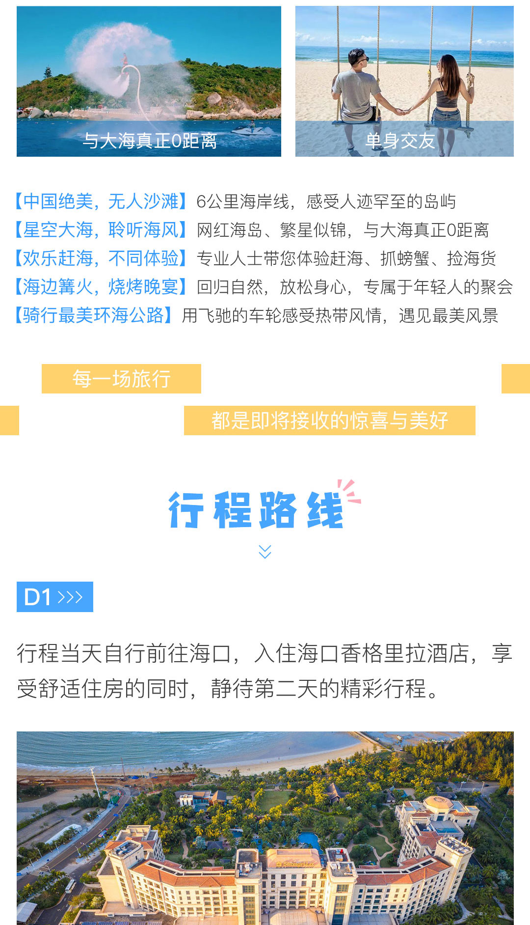 旅程为你串联了一路惊喜,你可以和有趣的小伙伴在这里踏浪嬉戏,置身海水的温柔怀抱,亦或是独自一人漫步海边,欣赏白浪逐沙滩,涤荡心中的烦心事。 旅行主题:单身旅行主题; 景观亮点:碧海蓝天、金色沙滩、椰林树影; 参团客群:18-38岁单身旅游爱好者; 团队人数:10人起成团,低于10人此团自动解散,所支付费用自动返回原账户; 集合解散:三亚出发,三亚散团; 特别告知:本产品全程纯玩无购物; 支付方式:在线支付+团上现付,详情请查看“费用包含”栏。