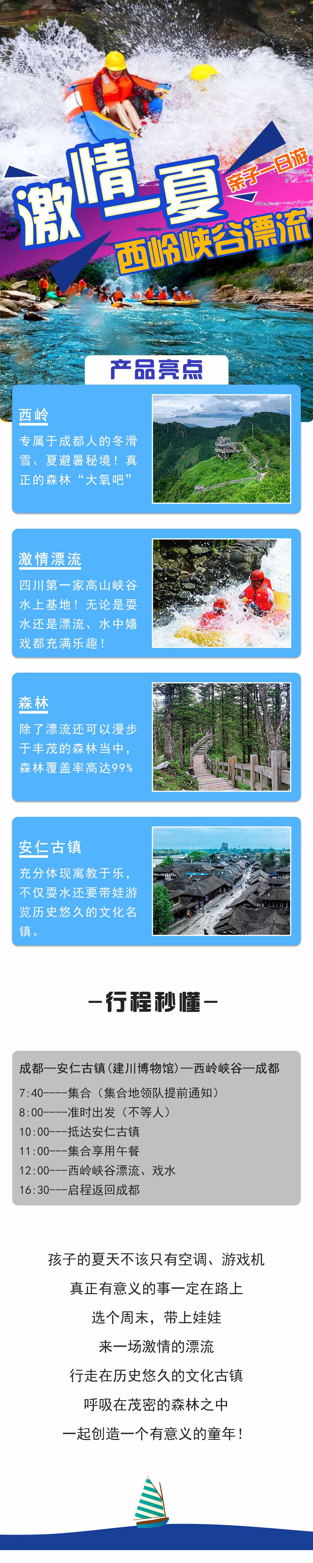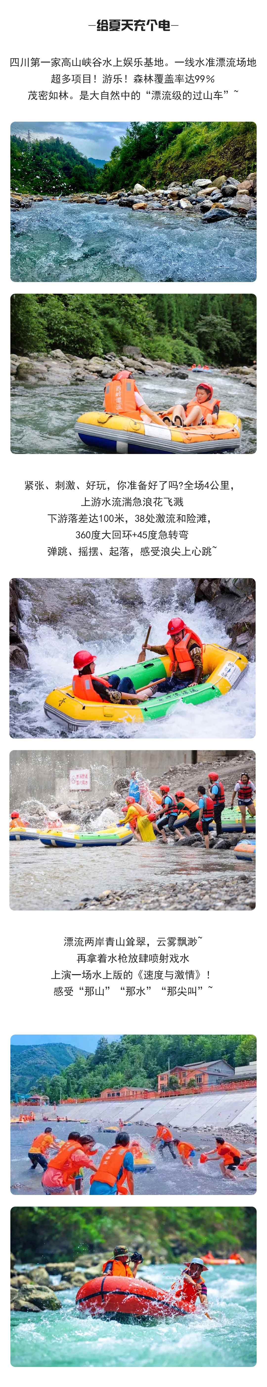 你还在市内感受着39度高温的煎熬吗?娃娃每天吹着空调过的夏天快乐吗?不如来一场激情漂流吧!距离近,当日往返。玩得爽,激情无限。专业人员全程安全保障,出行体验直线飙升! [产品性质]本产品为亲子游,儿童需家长陪同参加。(10岁以上儿童与成人同价,10岁以视情况而定需配备安全员50元/人) [成团须知]15-30人成团 [行程亮点]激情漂流,森林氧吧,文化古镇 [集合解散]成都出发,成都散团 [特别告知]本产品属于亲子游产品,真纯玩无购物。
