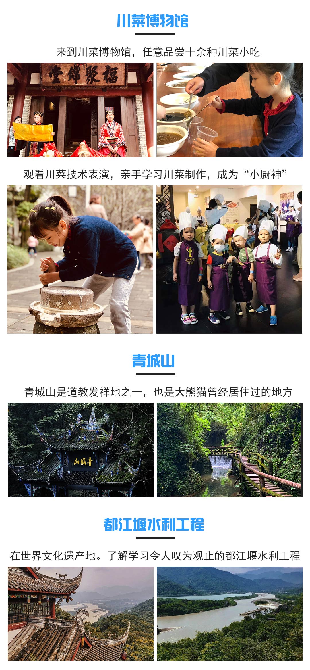 动物是人类的好朋友,熊猫是我们的国宝,每个小孩子都应该从小了解我们萌萌的国宝,学习熊猫科普课程,了解都江堰水利工程,观看川剧丰富川文化,学习川菜,泡温泉,问道青城山,丰富精彩的亲子游将给您和亲爱的孩子带来无限的美好回忆!