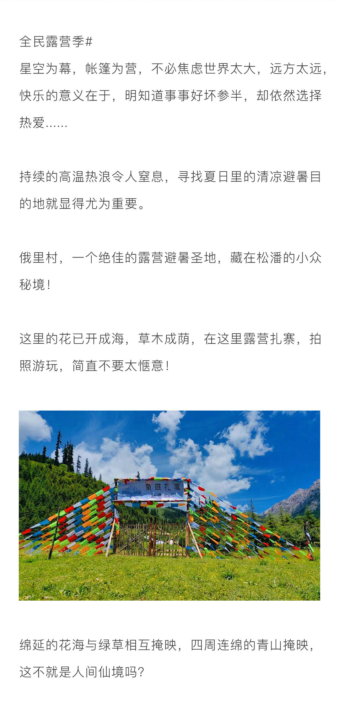 持续的高温热浪令人窒息,寻找夏日里的清凉避暑目的地就显得尤为重要。 俄里村,一个绝佳的露营避暑圣地,藏在松潘的小众秘境! 这里的花已开成海,草木成荫,在这里露营扎寨,拍照游玩,简直不要太惬意! 旅行主题:闺蜜游主题; 景观亮点:户外徒步,星空露营,特色美食,篝火晚会,骑马旅拍; 参团客群:中青年旅游爱好者; 团队人数:4人起成团,低于4人此团自动解散,所支付费用自动返回原账户; 集合解散:成都出发,成都散团; 特别告知:本产品全程纯玩无购物; 支付方式:在线支付+团上现付,详情请查看“费用包含”栏。