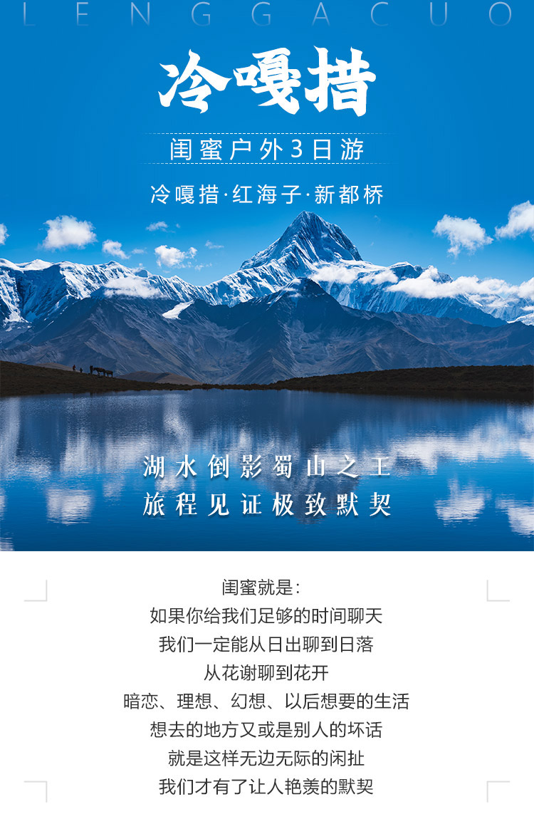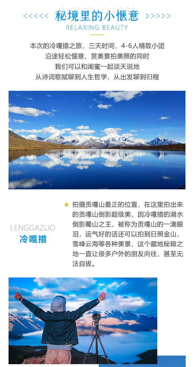 冷嘎措户外摄影3日游 贡嘎神山的一滴眼泪 精品中小团.有人说,身体和灵魂总有一个在路上,又有人说生活不止眼前的苟且,还有诗和远方,摄影者想说,趁着年华正好,以梦为马,去享受最美的日出,去拥抱最苍茫的云海,去看最华丽的斜日落山,去感受百万光年外最璀璨的星空,最后这些将成为记忆里最动人的风景。 和闺蜜一起看雪山、看日落、观海子,赏村落,和最默契的人来一场最舒适的旅行,遇到一处美景,你的一个眼神,她/他就知道该举起相机记录美好瞬间了。 旅行,这才刚刚开始!